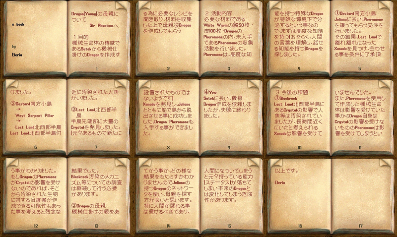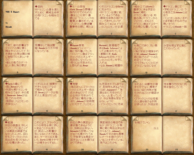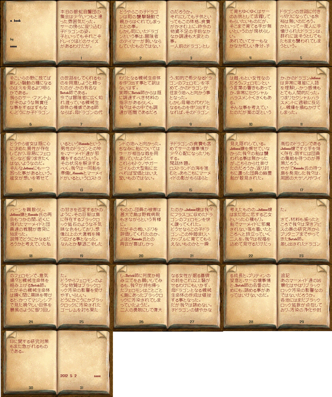 ・総括 先日の騒ぎがうそのように、時が止まったかのように静かなドーン女王の墓所で、女王に非礼をわび、カーラの墓石に手を置いて私はしばし瞑想した。ここ数か月の間というもの、忙しさにかまけて我が身を振り返る余裕もなかったが、いつの間にブリタニアは暑すぎず、かと言って涼しすぎもしない、実に良い季節になったようだ。 今回諸君からいただいたレポートのうち、alianrhod団員、Cesario団員、Chocolate団員、Mareni団員、Siel団員、Tokiwa団員、ZagZag団員のレポートを、EMリワードホールに展示させていただいた。さわやかな初夏の一日、ぜひ読書を決め込んでみてはいかがであろう。本当はまだまだ紹介したい私好み、かつユニークなレポートがたくさんあるのだが、スペースの都合上やむなく割愛したことを申し添えておく。 さて、諸君が心配した「ドラゴンのフェロモン」の試飲だが、スピリタスで割りたい誘惑は抗いがたく、フェロモンが蒸発して完全に消えるまで、私は詰め所の隅に置かれたそれを、未練がましく横目で見ていたことを告白する。消える前に匂いを嗅いでみたが、想像したような濃厚な匂いではなかったし、思いもかけないような味になることはまずなかったであろう。素直にいつも諸君が差し入れてくれる酒と肴をいただくとしよう。 私の傍らでは愛ナマコと若ドラゴンが食事をしている。心なしか若ドラゴンの食欲も落ちついたようだ。心優しい団員諸君からの差し入れで、彼も当分食べるものに困らないだろう。 最後にひとつ。ドラゴンのカップルに思いを馳せて、匿名希望の団員が、デートスポットのルーンブックを寄贈してくれた。こちらは詰め所にロックダウンしてあるので、ラブラブな諸君にぜひ活用してもらいたい。いずれもおすすめのスポットばかりである。